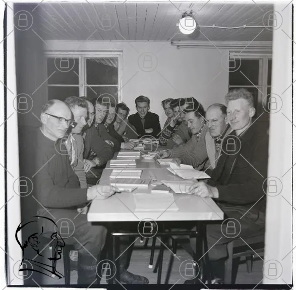 möte, män, bord, papper, skrivande, diskussion, inomhus, belysning, kläder, 1950-tal, grupp, samarbete, ansikten, stolar, fönster, dokument, organisation, tradition, samling, arbete, gemenskap, fokus, interaktion, presentation, ledarskap, aktivitet, socialt, professionellt, miljö