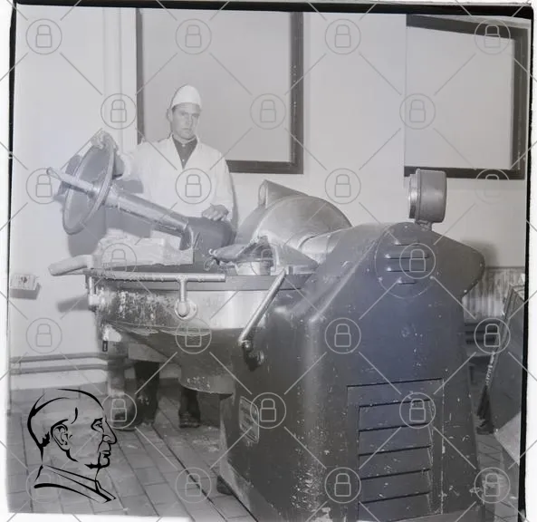 slaktare, kött, maskin, industri, arbete, vit, kläder, köksutrustning, gammal, fotografi, verkstad, professionell, hygien, skärmaskin, köttbearbetning, traditionell, man, arbetsmiljö, köttprodukter, slakt, hantverk, retro, svartvit, lokal, mat, livsmedel, hantverkare, yrke, historia