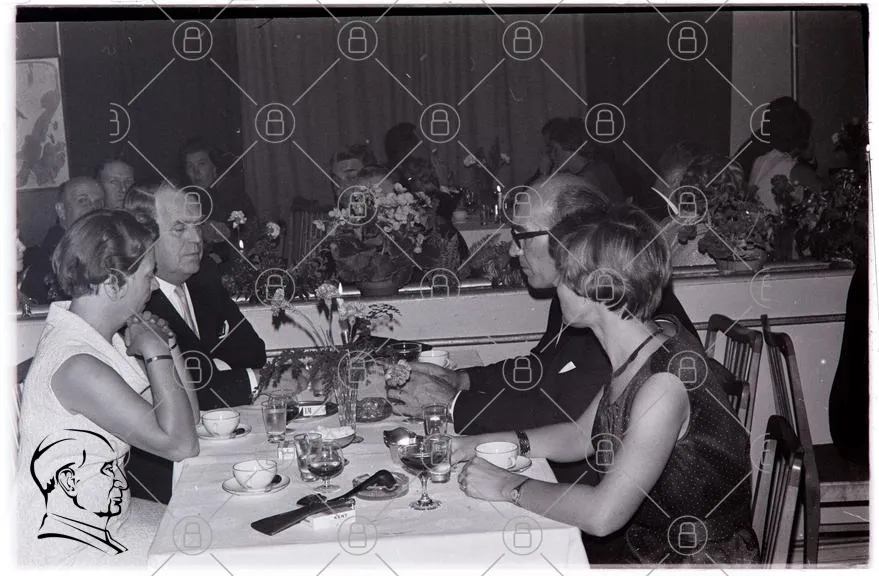 middag, sällskap, bord, blommor, glas, tallrikar, bestick, kläder, 1960-tal, svartvitt, fest, samtal, kvinnor, män, restaurang, dukat bord, dryck, kaffe, servetter, eleganta, socialt, samvaro, mat, stämning, interiör, vintage, retro, evenemang, artighet, skratt, diskussion