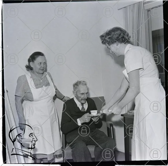 två kvinnor, man, äldre, servera, te, kaffe, kök, förkläden, sittande, stolar, inomhus, svartvitt, leende, socialt, interaktion, tradition, hemtrevligt, vård, omsorg, 1950-tal, retro, familjärt, gemenskap, vänskap, service, hjälp, omtanke, glädje, samvaro