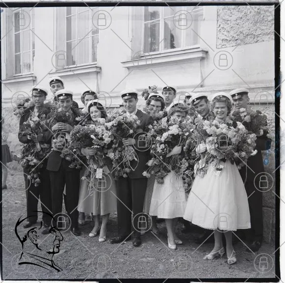 bröllop, blommor, fest, klänningar, kostymer, tradition, gruppfoto, 1900-tal, glädje, firande, ungdomar, brudpar, hattar, blommor, leenden, minnen, familj, vänner, ceremonin, historisk, svartvitt, stil, kultur, samling, festligheter, kärlek, skratt, tärnor, brudgummens vänner