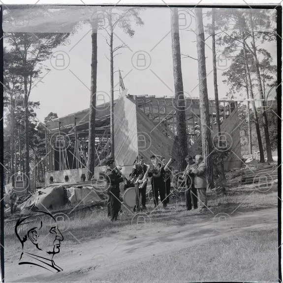 musiker, träd, byggnad, konstruktion, svartvit, band, instrument, trummor, fotografering, utomhus, 1900-tal, traditionell, samling, män, kläder, landskap, natur, musik, fest, kultur