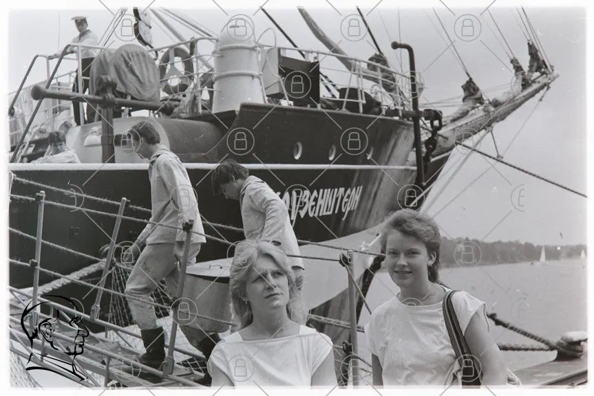 segelfartyg, människor, svartvit, båt, hamn, segling, kläder, kvinnor, män, trä, mast, rep, sommar, aktivitet, fotografering, nostalgi, 1980-tal, ungdomar, segel, vatten, landskap