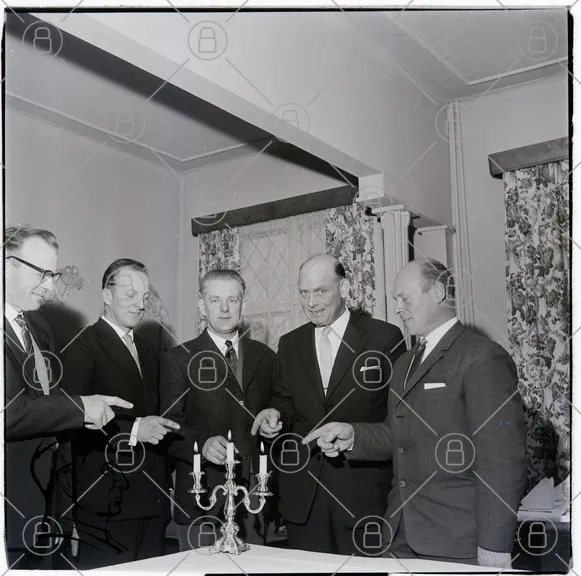 möte, män, kandelaber, pekande, bord, rum, kostymer, 1960-tal, inomhus, diskussion, affärsmän, formell, samarbete, ljus, dekoration, fönster, gardiner, grupp, presentation, gest, tradition, ceremoni, svartvitt, fotografi, historia, interiör, professionell, samling, uttryck, fokus