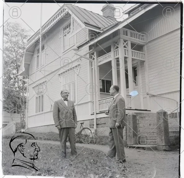 två män, hus, cykel, gräsmatta, träd, byggnad, 1900-tal, svartvitt, kostymer, arkitektur, fasad, landskap, utomhus, porträtt, stil, traditionell, historia, samspel, miljö, gator, detaljer, skugga, fotografering, män, vänskap, samtal, kultur, samhälle, natur