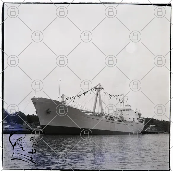 fartyg, skepp, hamn, vatten, lastfartyg, flaggor, last, transport, marin, sjöfart, industri, byggnad, kaj, segel, ankar, båt, landskap, svartvit, foto, historia