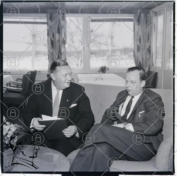 möte, män, kostymer, inomhus, 1900-tal, svartvitt, diskussion, kontor, fönster, möbler, växter, ansiktsuttryck, affärsmän, dokument, samtal, stil, professionell, interiör, relationer, historia