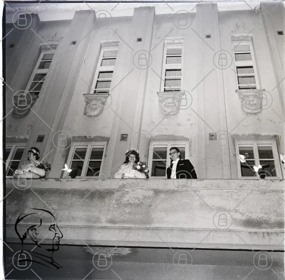 bröllop, fest, klänningar, brud, brudgum, dekorationer, blommor, balkong, svartvitt, 1950-tal, festligheter, leenden, tradition, sällskap, fotografering, byggnad, fönster, stil, elegans, glädje, minnen