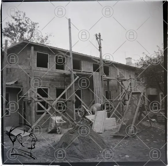 byggarbetsplats, hus, konstruktion, byggmaterial, trä, ställning, fönster, sand, cementblandare, verktyg, byggnadsställning, grus, byggnadsarbete, träd, gammal byggnad, renovering, byggnadsplats, arbete, hantverk, byggnadsarbetare, betong, murverk, byggnadsutrustning, landskap, utomhus, struktur, byggprocess, byggnadsdesign, byggnadsprojekt, byggnadsindustri
