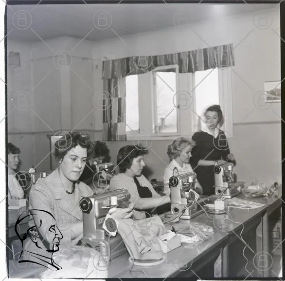 sy, kvinnor, symaskiner, utbildning, 1950-tal, hantverk, arbete, textil, klassrum, sömnad, retro, mode, handarbete, kreativitet, grupp, lärande, tradition, kvinnligt, yrke, samhälle, historia