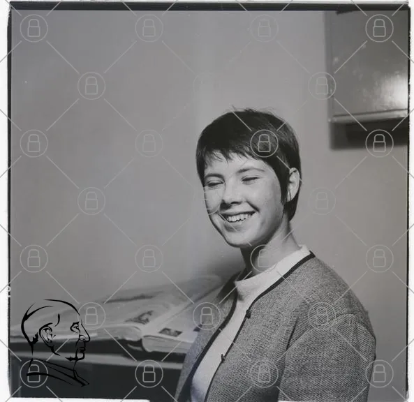 kvinna, leende, svartvitt, porträtt, inomhus, 1960-tal, kort hår, kläder, avslappnad, tidning, bakgrund, naturligt ljus, ungdomlig, ansiktsuttryck, fotografi, nostalgi, stil, mode, kultur, historia