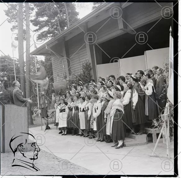 talare, publik, kvinnor, traditionella kläder, flaggor, träd, utomhus, sång, evenemang, samling, historisk, svartvitt, fest, kultur, gemenskap, scen, föreställning, musik, glädje, samhörighet, klänningar, män, tal, uppträdande, fotografering, minnen, festligheter, folkloristisk, artister, samling