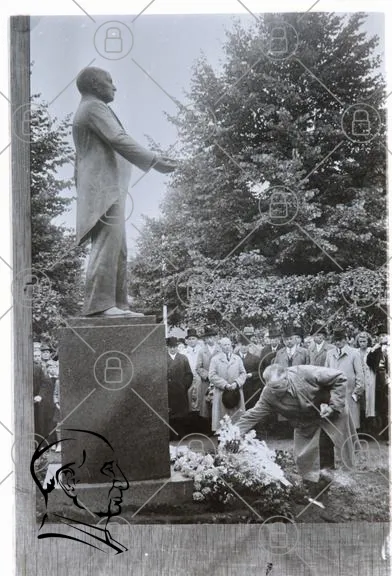 staty, blommor, ceremoni, människor, minnesstund, monument, historisk, svartvitt, offentlig, hyllning, träd, kläder, grupp, tradition, kultur, plats, 1900-tal, samhälle, minne, respekt