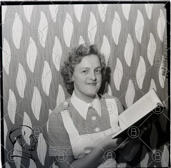 kvinna, bok, läsning, vintage, kläder, mönster, svartvitt, frisyr, leende, inomhus, 1950-tal, retro, interiör, utbildning, kultur, stil, mode, ansiktsuttryck, hand, text, papper, fotografi, tradition, nostalgi, kvinnoideal, hem, familj, hobby, intellekt, litteratur