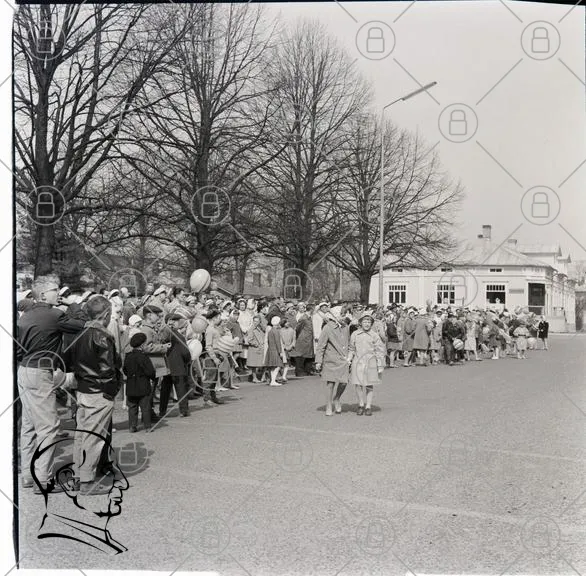 parad, barn, vuxna, ballonger, träd, gator, kläder, 1950-tal, samling, fest, publik, fotografering, tradition, evenemang, glädje, historisk, svartvit, folkmassa, torg, byggnader, vår, festligheter, leenden, barnkläder, vuxenkläder, stämning, minnen, kultur, gemenskap, aktivitet