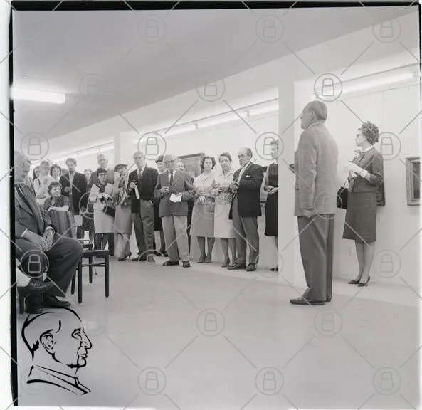 konstutställning, publik, talare, konstverk, gallerivägg, svartvitt, klädda, män, kvinnor, samling, evenemang, kultur, konstnärer, åhörare, sittande, stående, fotografering, 1950-tal, socialt, interaktion, konst, utställningslokal, konstälskare, tradition, gemenskap, upplevelse, konstnärlig