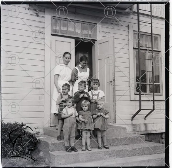 barn, kvinnor, trappa, hus, svartvitt, historisk, kläder, leende, familj, vårdare, utomhus, 1900-tal, gruppfoto, dörr, fönster, trädgård, sommar, glädje, tradition, gemenskap