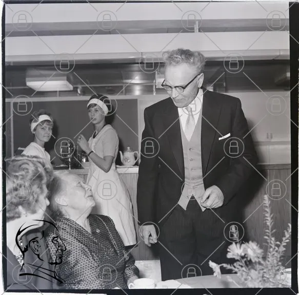 svartvitt, fotografi, 1950-tal, fest, klänningar, kostymer, kvinnor, män, servering, leenden, samtal, inomhus, retro, eleganta, servitörer, blommor, bord, te, kaffe, socialt, samvaro