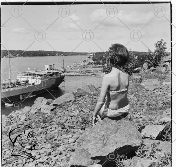 barn, båt, sjö, klippor, sommar, badkläder, landskap, natur, himmel, vatten, trä, sten, vy, fritid, segelbåt, strand, sol, rolig, avkoppling, resa, fotografi, svartvitt, nostalgi, utomhus, lek, barnlek, skärgård, båtliv, semester, lugn