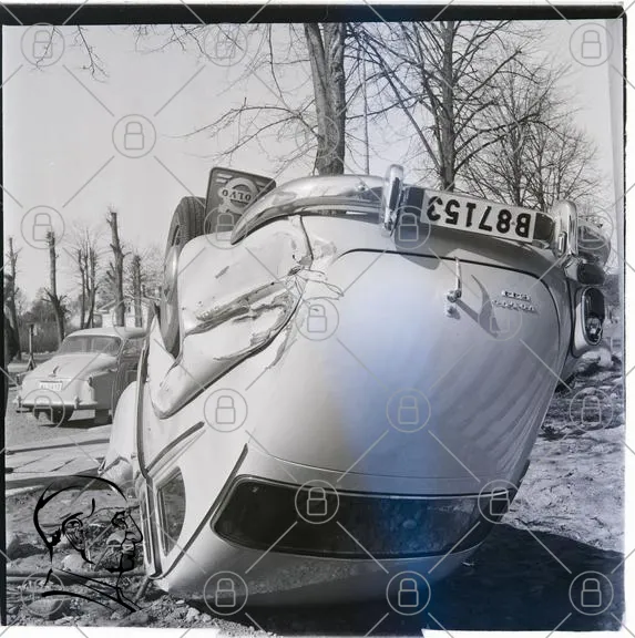 bil, krock, skada, registreringsnummer, 887133, svartvit, träd, väg, parkerad, gammal, bilvrak, olycka, motorfordon, landskap, fotografering, 1960-tal, retro, skrot, transport, fordon