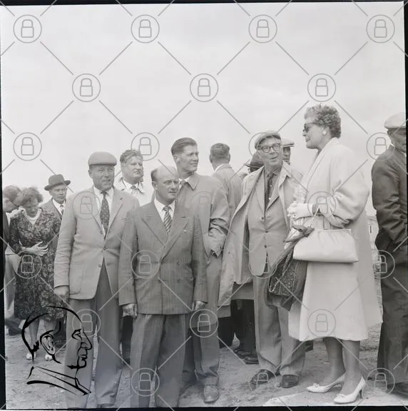 historisk, svartvit, grupp, människor, kläder, 1950-tal, utomhus, samling, män, kvinnor, hattar, kostymer, klänningar, socialt, evenemang, tradition, ansikten, interaktion, bakgrund, landskap, fotografering, minnen, stil, tidsepok, gemenskap, festligheter, kultur, historia, samhälle, samhörighet