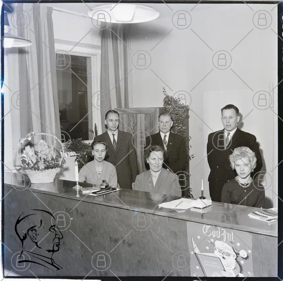 kontor, personal, svartvitt, 1950-tal, kvinnor, män, skrivbord, blommor, juldekoration, kläder, leenden, fotografering, inredning, lampor, fönster, dokument, kontorsmiljö, traditionell, affärsmiljö, professionell, gruppbild