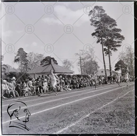 löpning, tävling, sport, publik, träd, hus, 1900-tal, svartvitt, idrott, barn, vuxna, glädje, motion, landskap, evenemang, tradition, gemenskap, utomhus, hastighet, prestation