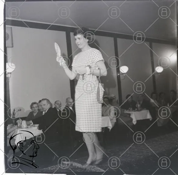 modell, mode, catwalk, 1950-tal, klänning, spegel, restaurang, publik, svartvitt, fotografi, stil, kvinna, skor, handväska, belysning, bord, stolar, evenemang, retro, elegans, visning, frisyr, smycken, leende, socialt, fest, tradition, kultur, modevisning, ängelholm