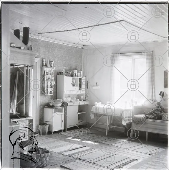 rum, inredning, kök, fönster, bord, stolar, hyllor, köksutrustning, mattor, ljus, väggar, fönsterbräda, korg, retro, svartvitt, möbler, gardiner, väggdekoration, golv, heminredning