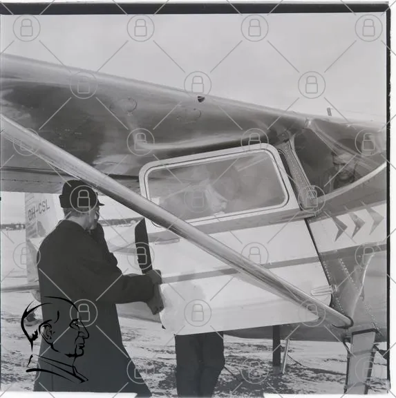 flygplan, man, fönster, pilot, flygning, vinter, snö, hatt, kläder, teknik, transport, luftfart, säkerhet, landning, flygplats, motor, propeller, cockpit, passagerare, manuell, arbete, historia, svartvitt, fotografi, utomhus, män, interaktion, fordon, flygningserfarenhet, tradition