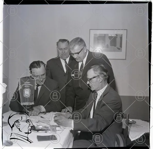 möte, män, skrivbord, dokument, flagga, 1960-tal, kostymer, papper, diskussion, skrivande, bord, inomhus, svartvitt, affärsmän, samarbete, formalitet, presentation, grupp, ledarskap, tradition, historia, professionell, interaktion, fokus, detaljer, kontor, affärsmöte, signatur, avtal, protokoll