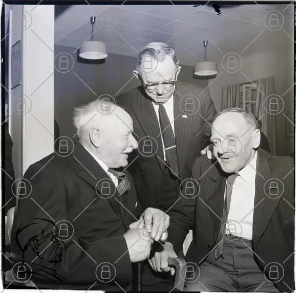 män, äldre, samtal, inomhus, kläder, kostymer, möte, leenden, stolar, fönster, lampor, svartvitt, ansikten, uttryck, vänskap, diskussion, socialt, interaktion, 1900-tal, nostalgi
