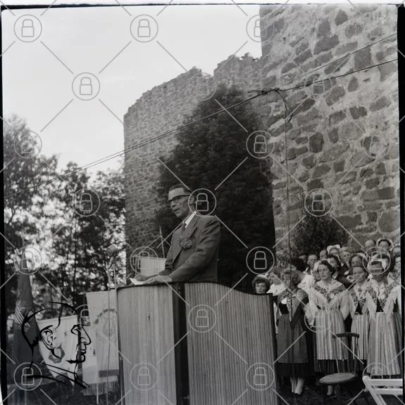 talare, podium, publik, kläder, traditionella, flaggor, träd, stenhus, svartvitt, fest, evenemang, kvinnor, män, historia, samling, utomhus, tal, ceremonin, kultur, gemenskap, minne, festligheter, klänningar, folkdräkt, talarstol, bakgrund, fotografering, 1900-tal, högtid