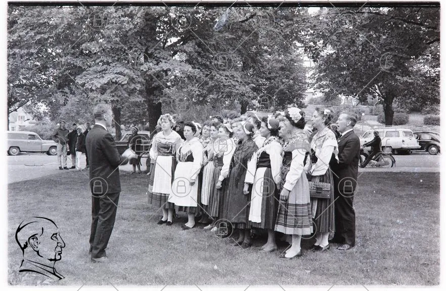 grupp, sång, traditionell, kläder, kvinnor, män, utomhus, träd, samling, svartvit, folkloristisk, fest, kultur, musik, uppträdande, historisk, gemenskap, glädje, evenemang, folkdräkt, konsert, artister, publik, scen, dans, festligheter, minnen, samhörighet, uttryck, glädje