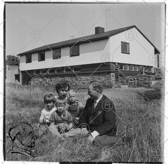 familj, barn, vuxna, hus, gräs, svartvitt, 1960-tal, utomhus, samling, leende, pojkar, flicka, kläder, sittande, fotografi, tradition, hem, landskap, interaktion, gemenskap, natur, byggnad, stil, retro, minnen, historia, familjebild, barnlek, föräldrar, syskon