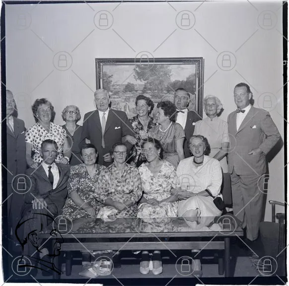 grupp, människor, porträtt, familj, kläder, leenden, inomhus, möbler, bord, svartvitt, 1950-tal, samling, fest, tradition, äldre, yngre, kvinnor, män, bakgrund, målning, glasögon, slips, blommönster, klänningar, kostymer, fotografi, minnen, socialt, samvaro, gemenskap