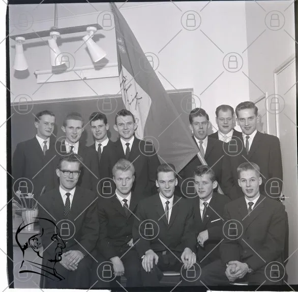grupp, män, kostymer, flagga, svartvitt, porträtt, 1960-tal, skolklass, formell, samling, inomhus, leende, tradition, ungdomar, presentation, akademisk, stil, fotografering, gemenskap, historia, utbildning, klassrum, flaggstång, kläder, stil, ansikten, minnen, vänskap, samarbete, evenemang