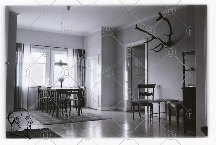 rum, inredning, svartvitt, bord, stolar, fönster, gardiner, lampa, väggar, golv, matta, blommor, dörrar, renhorn, möbler, minimalistisk, heminredning, naturligt ljus, retro, stilren