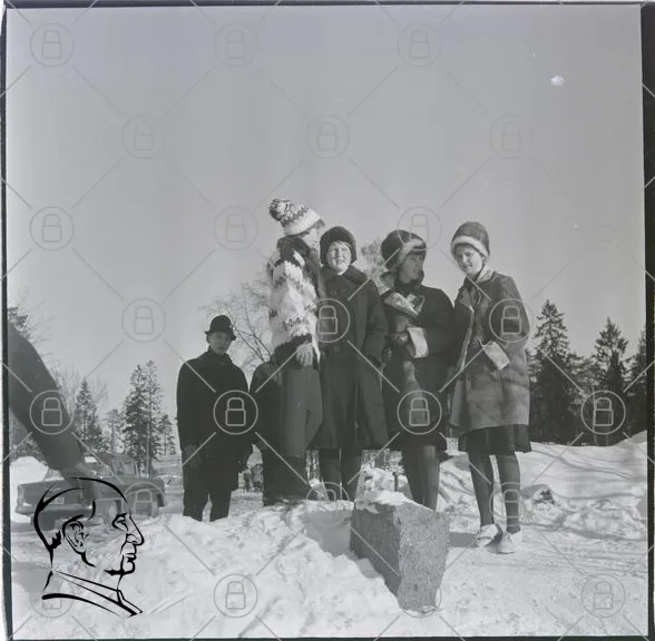 snö, vinter, kvinnor, kläder, hattar, träd, bil, svartvitt, fotografering, 1960-tal, landskap, grupp, friluft, mode, stil, skratt, minnen, tradition, familj, vänner