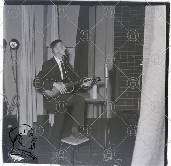 man, gitarr, mikrofon, scen, svartvit, kläder, sittande, musik, underhållning, 1950-tal, artist, studio, ljus, publik, framträdande, stol, kavaj, byxor, skor, sång, instrument, retro, fotografi, kultur, kreativitet, performance, ljud, uttryck, stil, klassisk