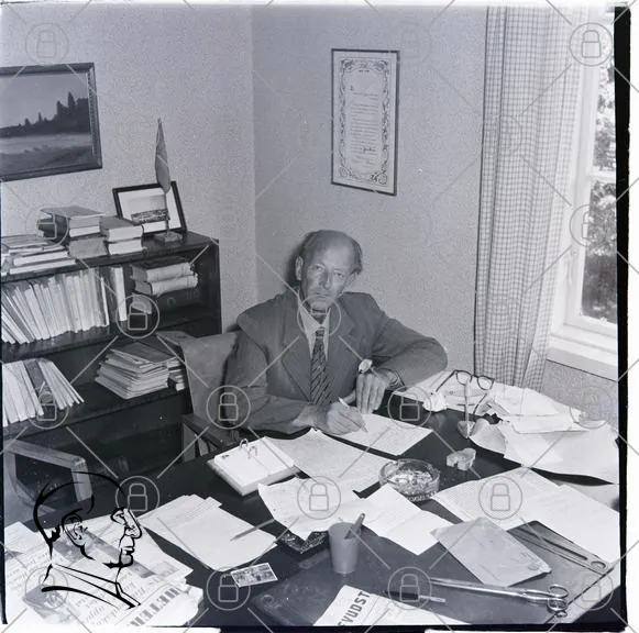 man, skrivbord, papper, böcker, kontor, fönster, glas, pennor, dokument, skrivande, svartvitt, inomhus, möbler, tidningar, lampa, anteckningar, arbetsyta, professionell, 1950-tal, kontorsmiljö