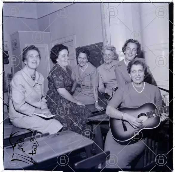 kvinnor, gitarr, klassrum, 1950-tal, kläder, leende, samling, skolmiljö, musik, vintage, porträtt, utbildning, bänkar, vänner, socialt, aktiviteter, svartvitt, fotografi, gemenskap, kvinnor i grupp, traditionell, kultur, nostalgi, interiör, skola, lärande, glädje, samarbete, kreativitet, minnen
