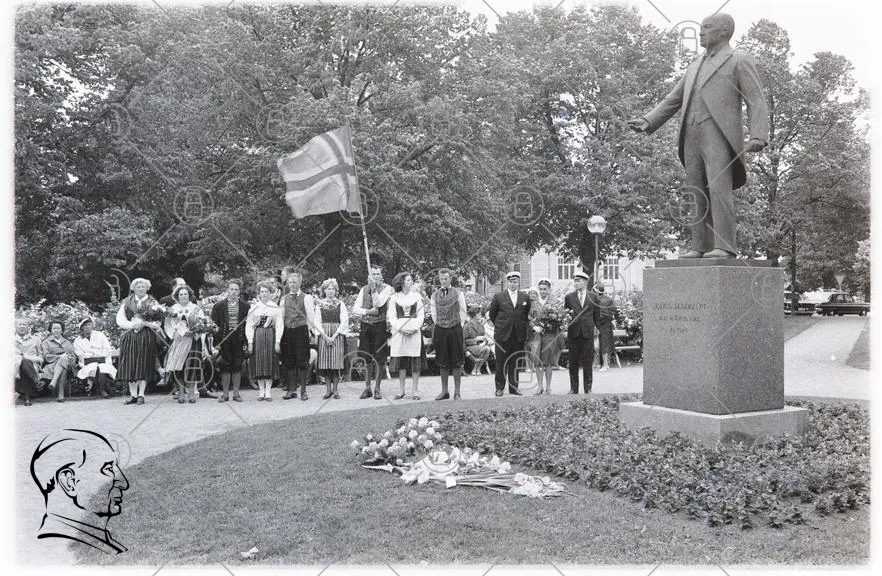 staty, blommor, flagga, park, människor, traditionella kläder, minnesceremoni, svartvitt, samling, träd, monument, historisk, fest, kultur, högtid, 1900-tal, samhälle, firande, nationaldag, skulptur, gruppfoto, minnesmärke, offentlig plats, artister, ungdomar, vuxna, gemenskap, patriotism, historia