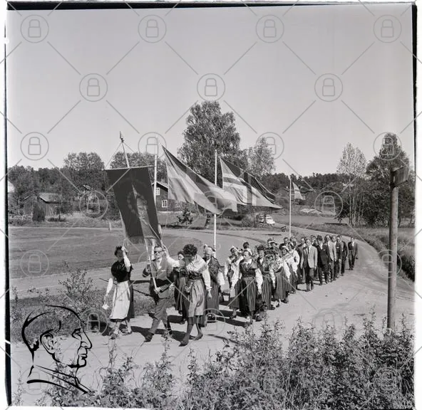parad, flaggor, traditionell, kläder, folkdräkt, landsbygd, marsch, fest, gemenskap, historia, kultur, kvinnor, män, träd, väg, byggnader, sommar, svartvitt, fotografering, samling, festligheter, nationaliteter, festkläder, folklig, procession, glädje, firande, natur, landskap, samhälle