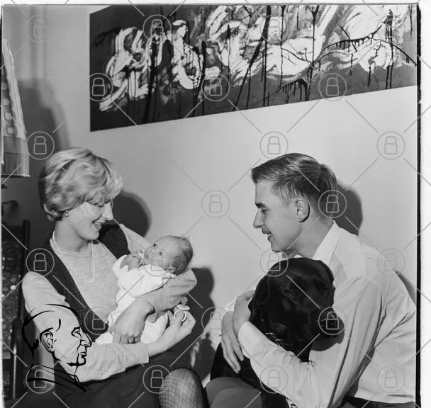 familj, baby, hund, föräldrar, svartvitt, inomhus, leende, kärlek, hem, konst, barn, 1960-tal, interiör, samvaro, glädje, tradition, porträtt, nostalgi, trygghet, relationer