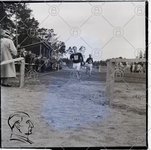 löpning, tävling, idrott, sport, publik, stadion, nummerlappar, män, träning, 1950-tal, svartvitt, motion, hastighet, utomhus, lopp, prestation, hejarop, banan, skog, kläder, nummer 22, nummer 24, fotografering, tradition, gemenskap, ungdomar, aktivitet, adrenalinkick, fokus, mål