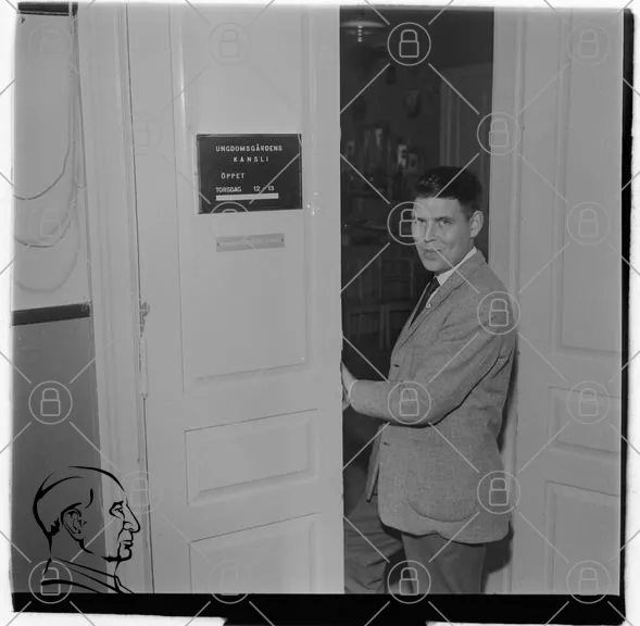 man, dörr, skylt, ungdomsrådgivning, öppet, 10-18, inomhus, kläder, 1950-tal, svartvitt, interiör, kontor, professionell, leende, socialt arbete, rådgivning, besökare, väntrum, atmosfär, historisk