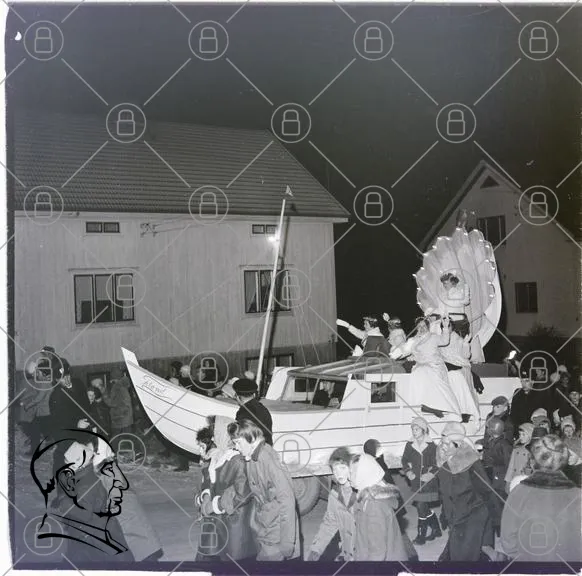 båt, fest, människor, kläder, barn, vuxna, hus, vinter, tradition, parader, ljus, dekoration, tåg, gammal, svartvit, samling, glädje, firande, kultur, gemenskap, aktivitet, historisk, scen, utomhus, festligheter, fotografering, minnen, nöje, samhälle