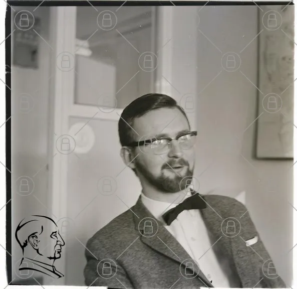 man, glasögon, skägg, kostym, slips, svartvitt, porträtt, inomhus, leende, 1960-tal, kontor, professionell, stil, kläder, ansikte, uttryck, fotografi, retro, vintage, elegant