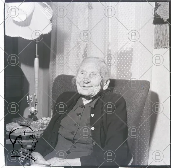 gammal kvinna, porträtt, svartvitt, inomhus, möbler, lampa, sittande, leende, traditionell klädsel, hem, vintage, familj, nostalgi, hemtrevligt, textilier, bord, kuddar, väggdekoration, fönster, ljus, ansiktsuttryck, äldre, kultur, historia, livserfarenhet, sällskap, värme, trygghet, minnen, generationer